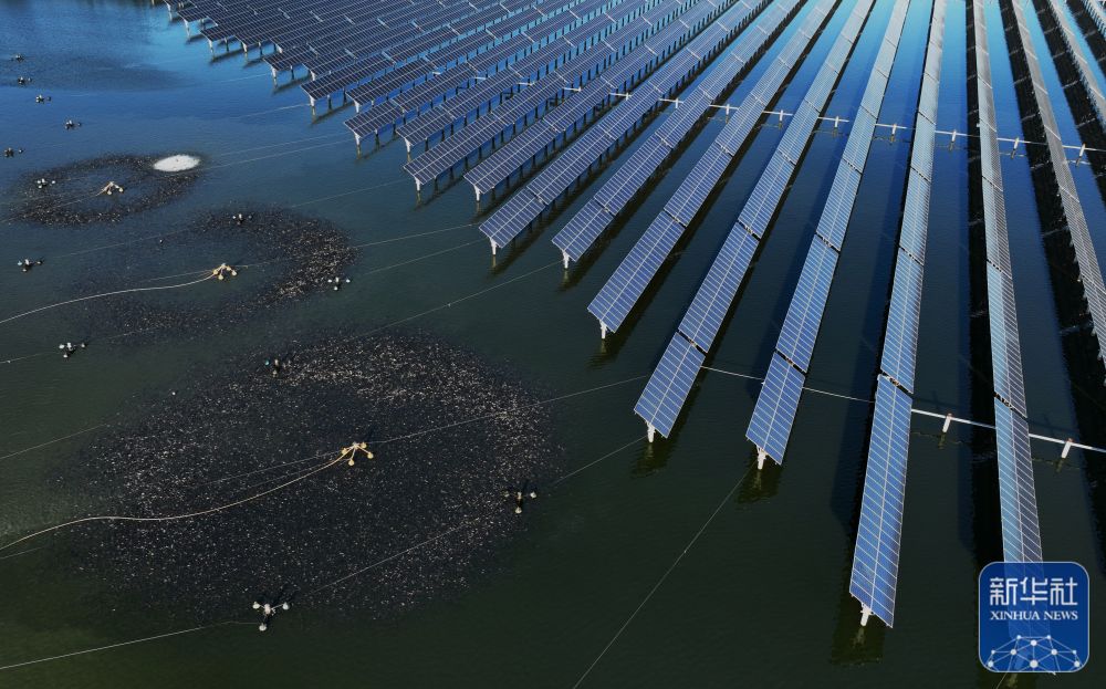 ↑2023年9月16日,鱼群在河北省唐山市丰南区黑沿子镇“渔光一体”现代渔业产业园鱼塘内觅食(无人机照片)。新华社记者 杨世尧 摄