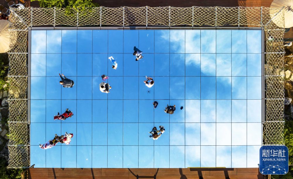 ↑2023年4月29日,游客在贵州省黔西市化屋露营基地“天空之镜”景点休闲游玩(无人机照片)。新华社发(范晖 摄)
