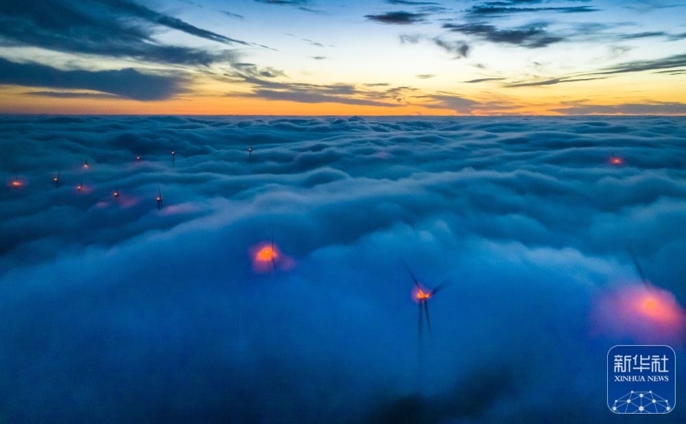 ↑2023年2月23日晚在湖北省宜昌市秭归县两河口镇云台荒村拍摄的风力发电机组(无人机照片)。新华社发(郑家裕 摄)