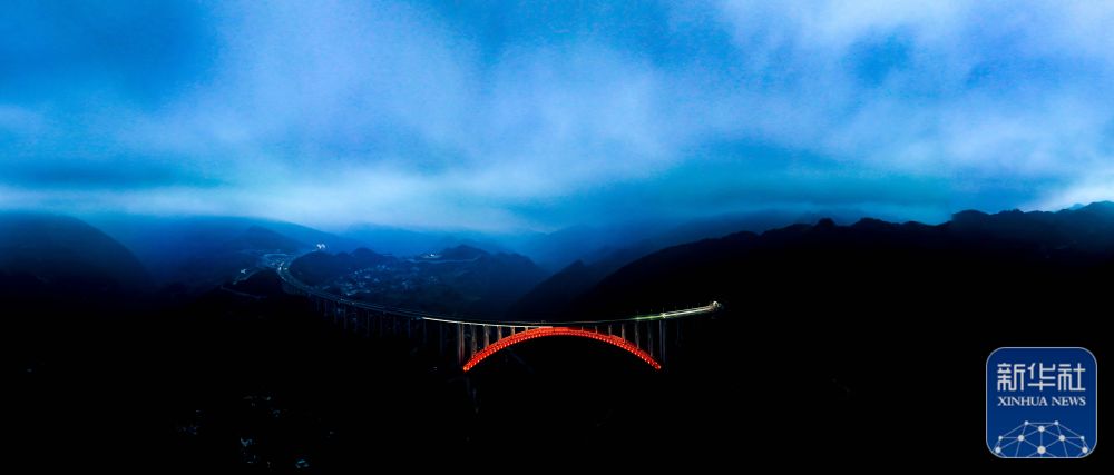↑2023年2月2日在贵州省遵义市拍摄的夜幕下的大发渠特大桥(无人机全景照片)。大发渠特大桥全长1427米、主跨410米、桥宽33米,是仁遵高速公路的控制性工程之一。新华社记者 欧东衢 摄