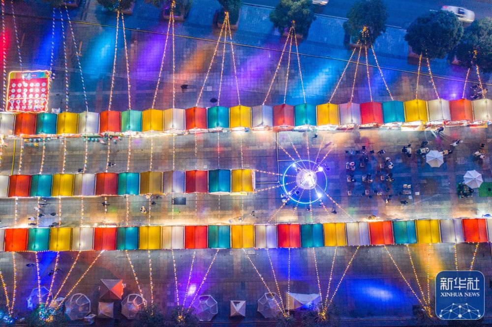 ↑2023年2月9日晚在重庆市南岸区南滨路旁拍摄的彩虹集市(无人机照片)。2023年,重庆发布多条政策措施鼓励夜间消费,不断调整优化业态、改善消费环境,对多个特色夜市街区进行了提档升级,“夜经济”成为推动重庆建设国际消费中心城市的新动力。新华社记者 黄伟 摄