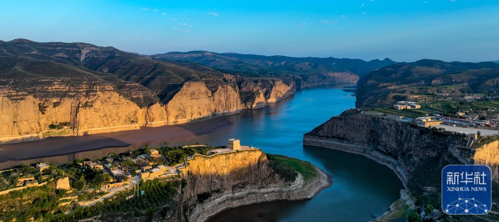 ↑2023年8月29日在山西省偏关县拍摄的晨曦下的黄河老牛湾,长城和黄河在此“握手”(无人机照片)。新华社记者 刘金海 摄