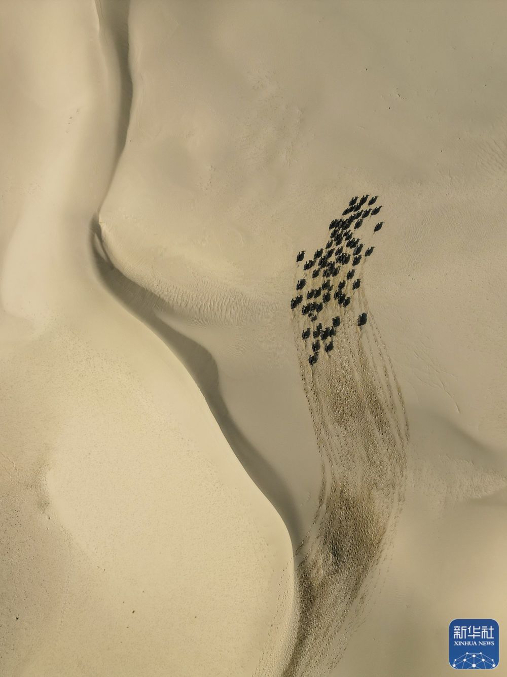 ↑2023年9月14日在新疆境内的阿尔金山国家级自然保护区库木库里沙漠拍摄的一群野牦牛(无人机照片)。新华社记者 郝昭 摄
