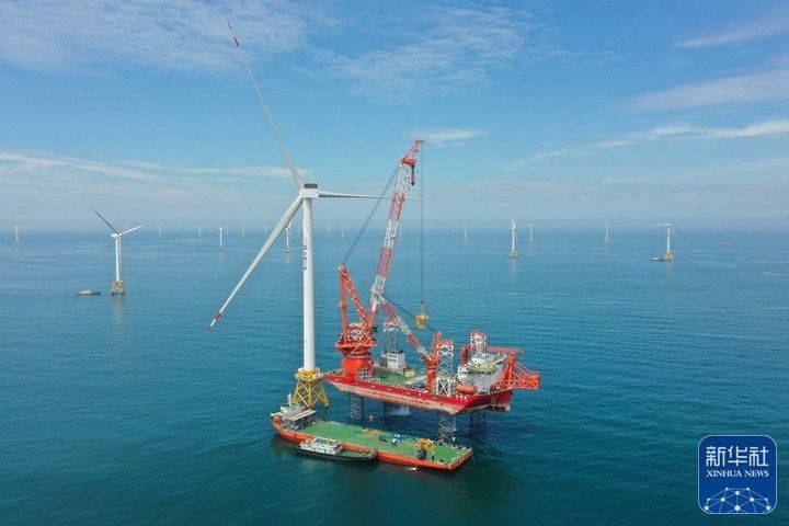 ↑2023年6月28日,全球首台16兆瓦海上风电机组在福建北部海域顺利完成吊装(无人机照片)。这标志着我国海上风电高端装备制造能力、深远海海上风电施工等全产业链实现整体提升,达到国际领先水平。新华社记者 林善传 摄