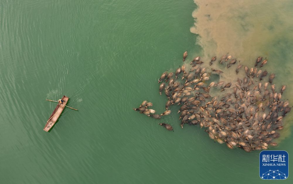 ↑2023年5月13日,在四川省南充市蓬安县相如镇油房沟村嘉陵江段,成群结队的水牛渡江(无人机照片)。新华社发(周修建摄)