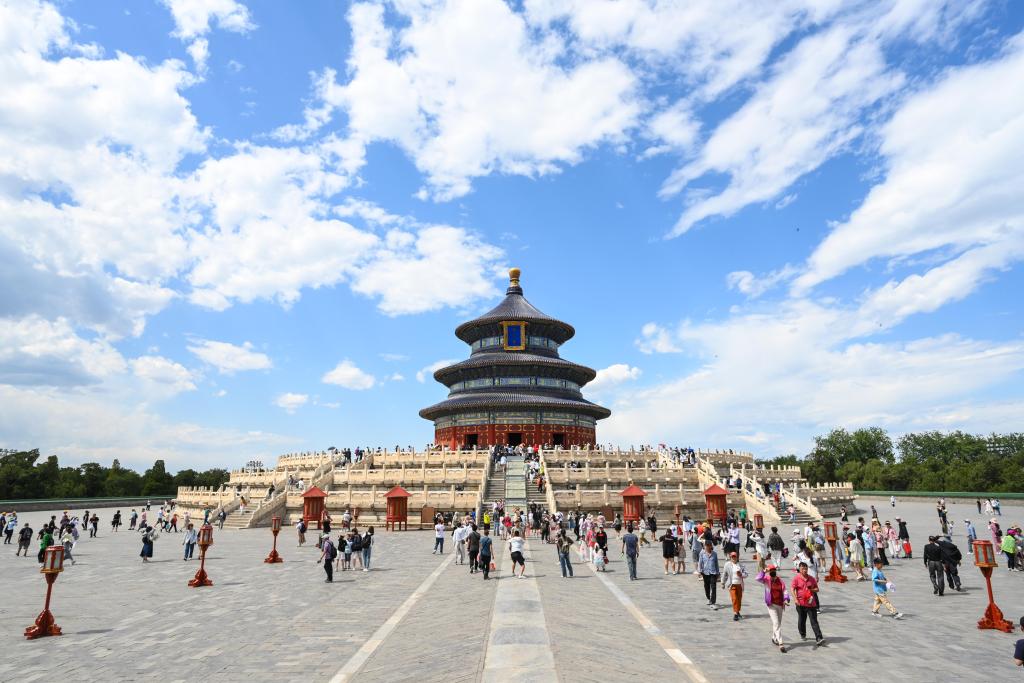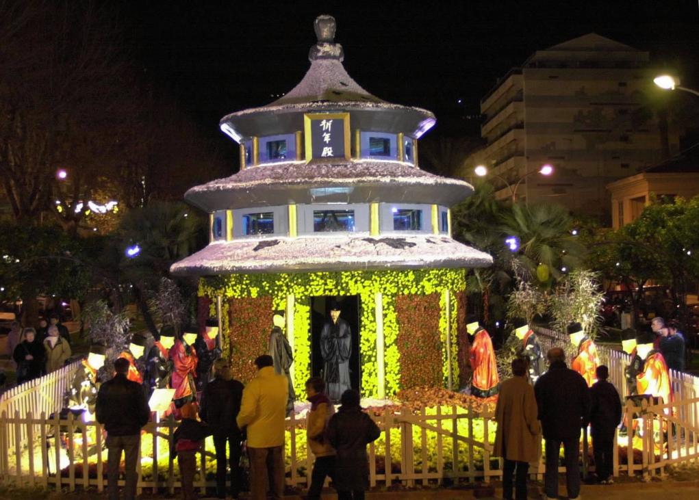 ↑2000年,法国南部海滨小城芒东市以中国文化为题材,用长城、天坛、兵马俑、江南园林等名胜古迹装点城市。图为该市搭建的天坛祈年殿。