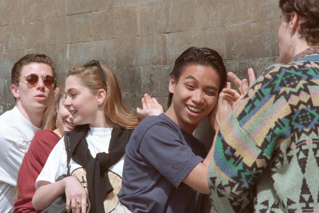 ↑1992年,来中国参加演出的法国青年芭蕾舞团成员游览天坛公园时,神奇的回音壁令他们兴致盎然。