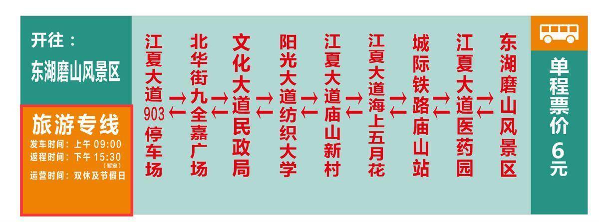 湖北日报讯(记者黄磊、通讯员陈祺民、方婷婷)1月6日起,武汉公交上新1条节假日“定制旅游专线”,由江夏大道公交停保场至东湖磨山景区。该线路串联起了江夏纸坊、庙山两个片区,方便区域内的市民、高校学子节假日乘公交直达东湖磨山景区游玩。