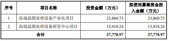芯源微2019年12月10日发布的首次公开发行股票并在科创板上市招股说明书显示,公司拟募集资金37,778.97万元,用于高端晶圆处理设备产业化项目、高端晶圆处理设备研发中心项目。