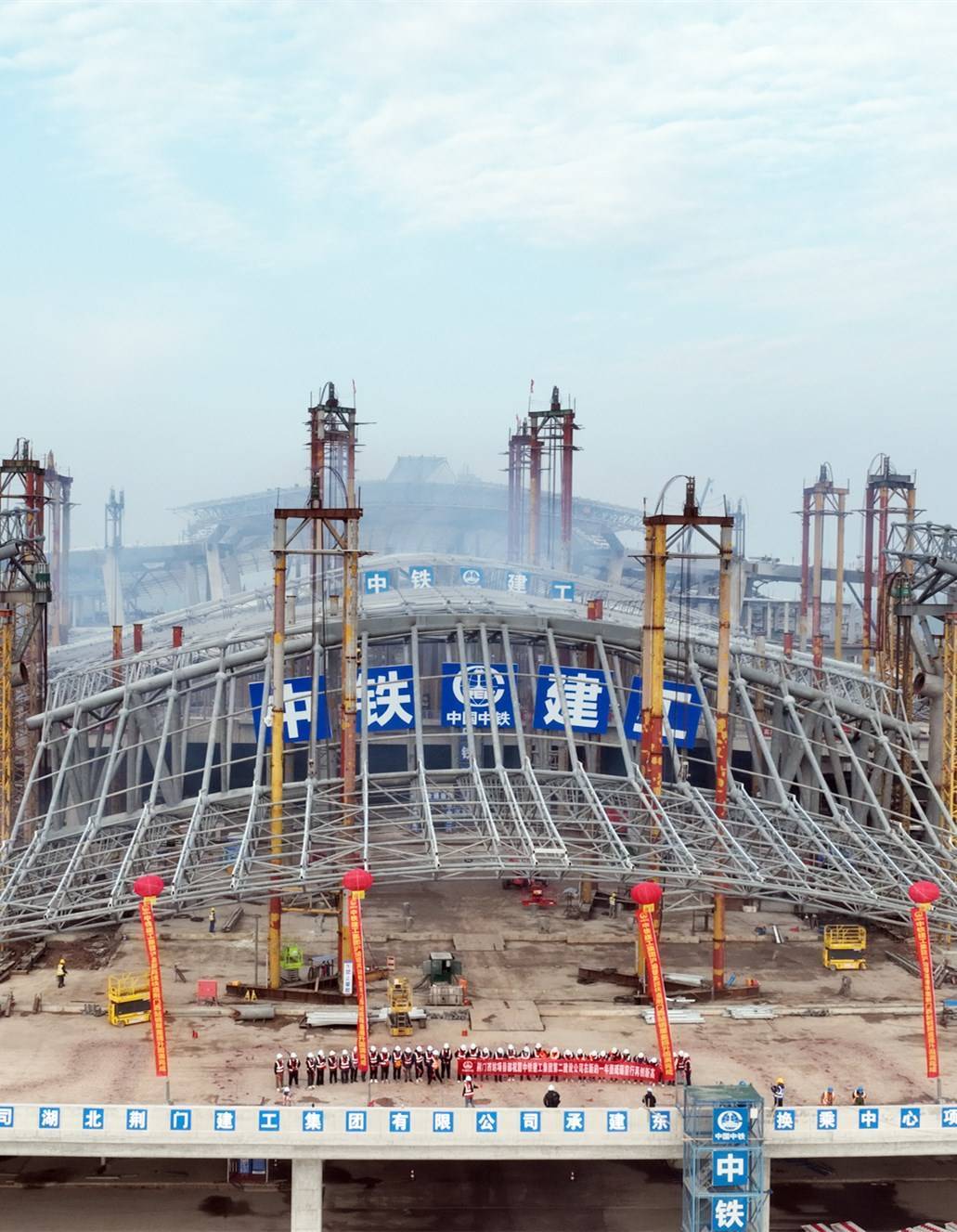 在荆门西站,“展翅欲飞”的轮廓显现,重达4686吨的钢结构已经顺利吊装完毕。银灰色的钢架构上,工人师傅们正在展开细部结构装修。中铁建工荆门西站项目部经理李正帅介绍,荆门西站作为沿江高铁与荆荆高铁的共用车站,将先于沿江高铁建成,计划2024年12月投用。