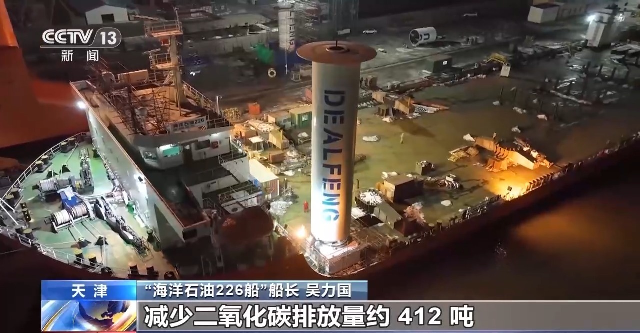 “海洋石油226船”船长 吴力国:项目团队在设计前期深入开展船舶应用环境与能耗仿真模拟分析,通过加装旋筒风帆系统,平均每年可节约燃料达12%,减少二氧化碳排放量约412吨,并可实现全生命周期受益。