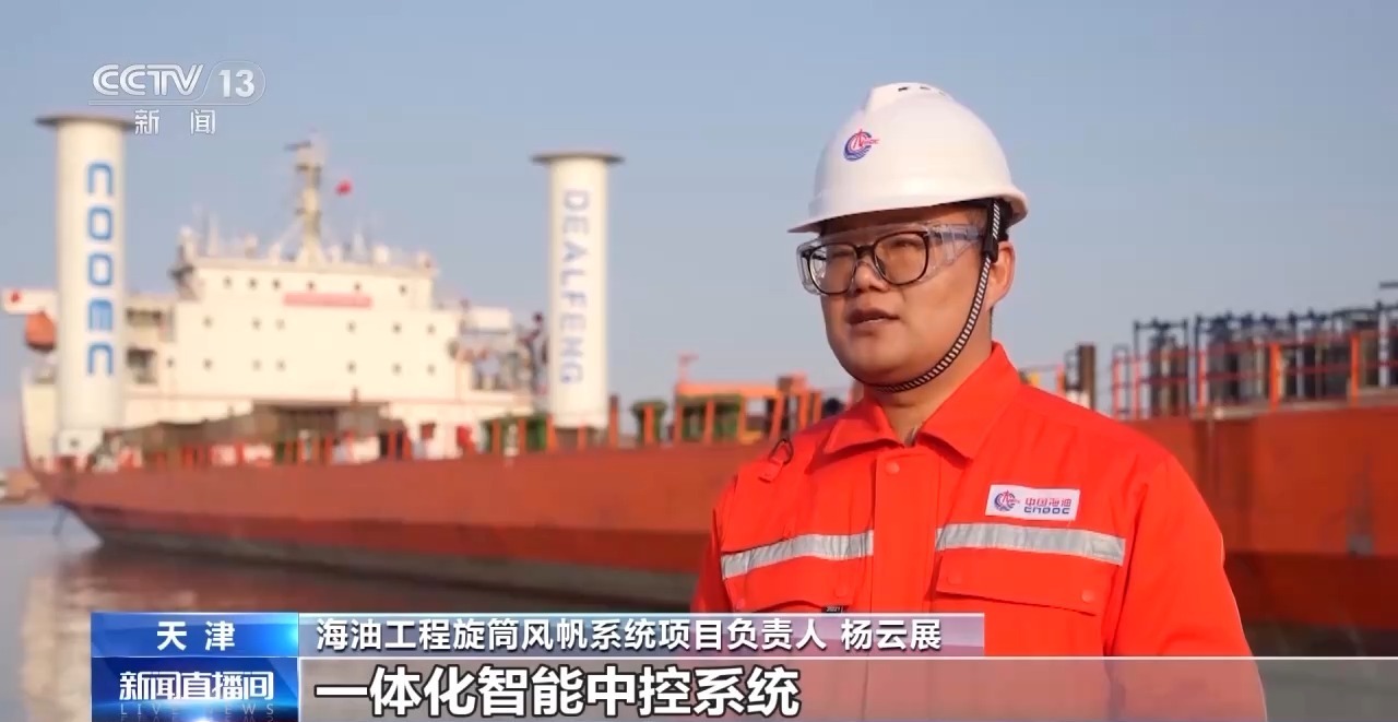 海油工程旋筒风帆系统项目负责人 杨云展:项目首创功能性可拆卸底座,一体化智能中控系统,自动获取航线风速和风向,并调整旋筒风帆工作姿态以获取最大动能,为船舶行业绿色发展和智能化操控提供一种全新模式。
