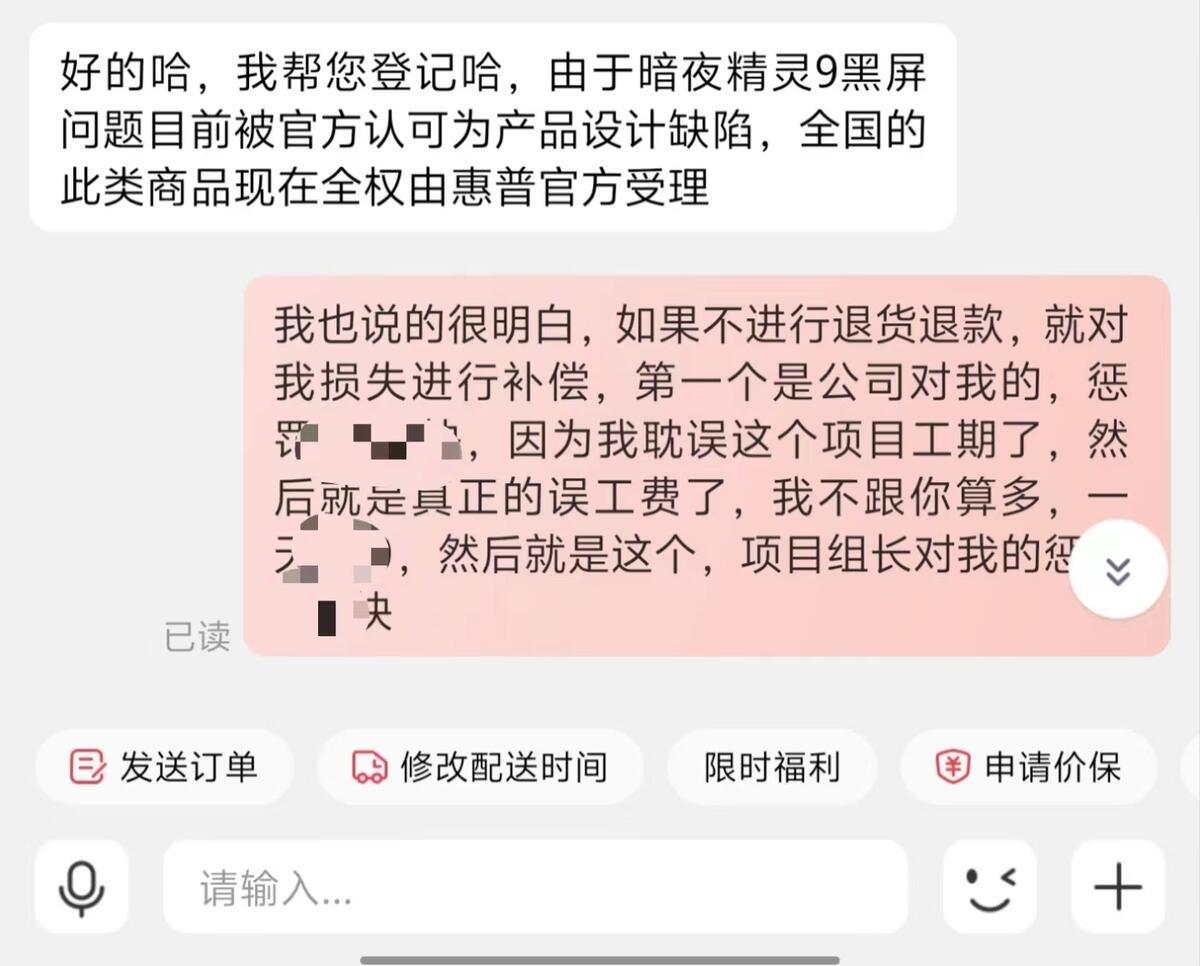 当李先生想找到京东客服讨个说法时,京东客服却以“暗夜精灵9黑屏问题目前被官方认可为产品设计缺陷”为由,希望李先生找惠普官方解决这个问题。
