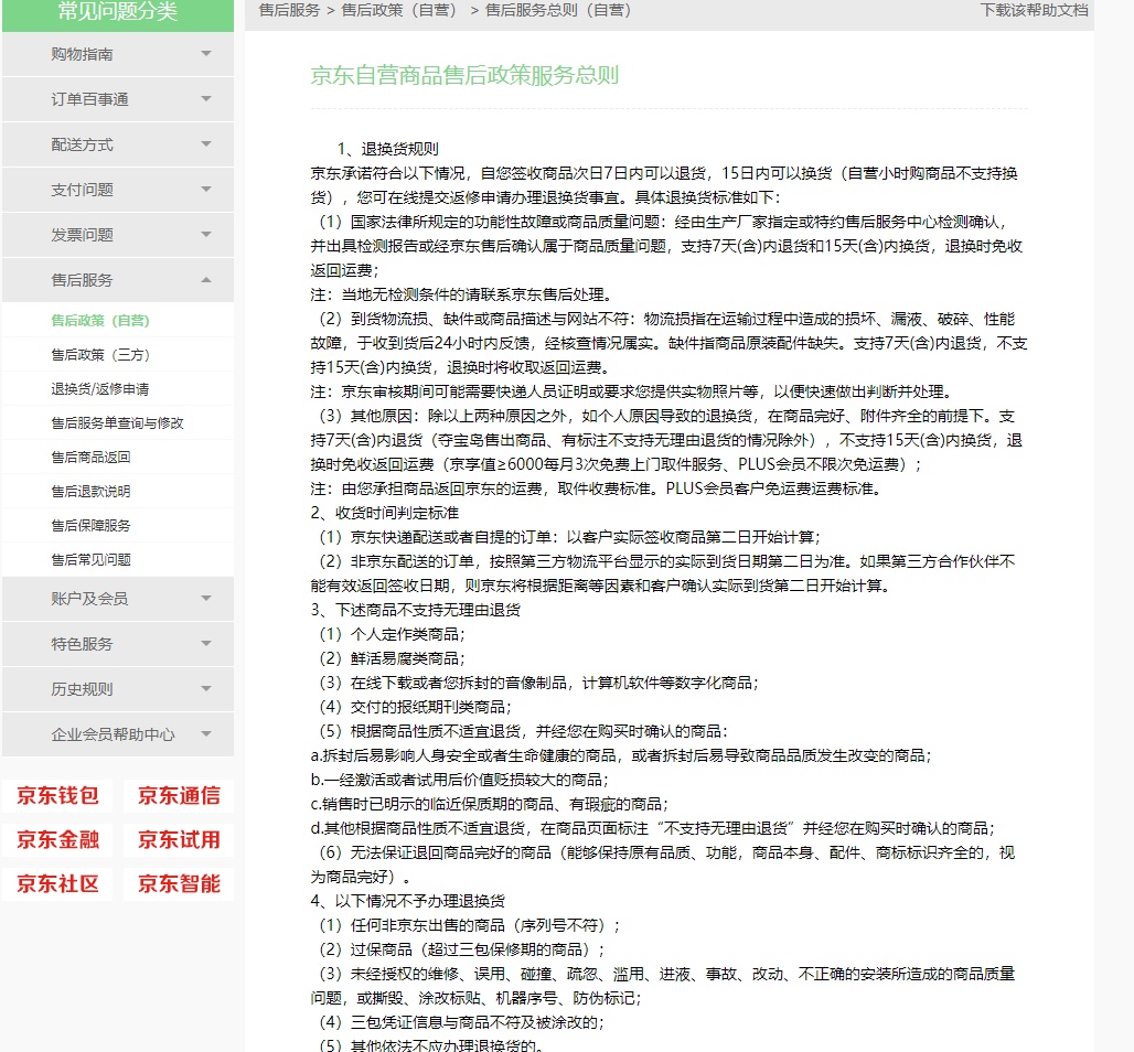 浙江在线记者发现京东自营商品售后政策服务总则显示,国家法律所规定的功能性故障或商品质量问题,经由生产厂家指定或特约售后服务中心检测确认,并出具检测报告或经京东售后确认属于商品质量问题,支持7天(含)内退货和15天(含)内换货。