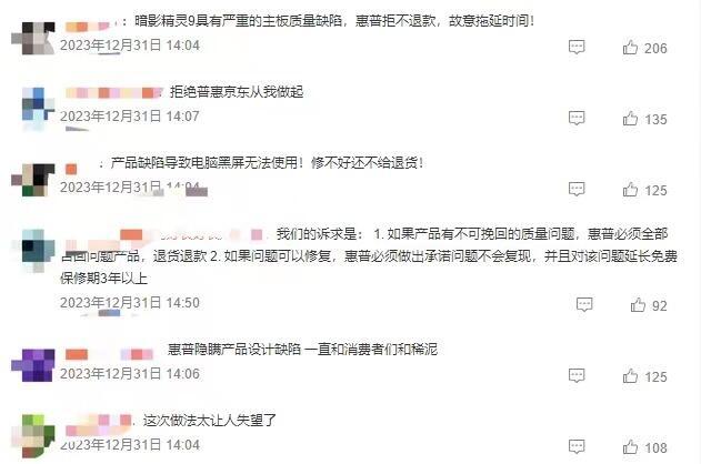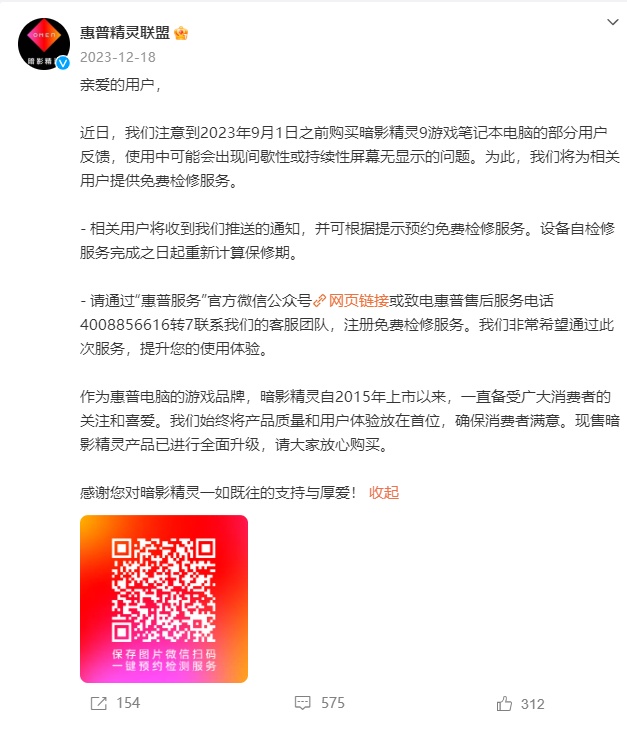 浙江在线记者注意到,去年12月18日“惠普精灵联盟”官方微博曾发布公告称:“近日,我们注意到2023年9月1日之前购买暗影精灵9游戏笔记本电脑的部分用户反馈,使用中可能会出现间歇性或持续性屏幕无显示的问题。为此,我们将为相关用户提供免费检修服务。”至于为何会出现屏幕无显示的问题,维修后能否彻底解决此问题,哪些用户可以申请免费检修服务等,公告中并无涉及。