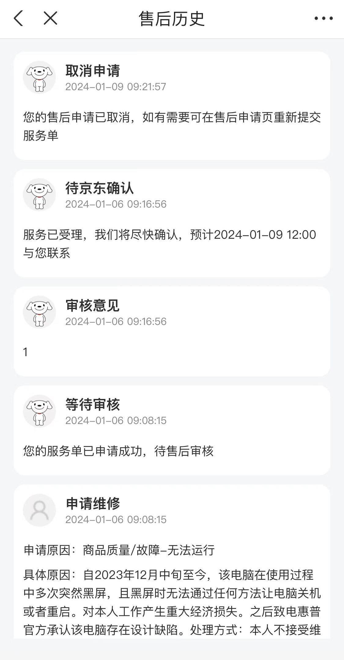 王先生告诉浙江在线记者,他购买的同样是惠普暗影精灵9笔记本电脑。1月6日上午,他向京东客服提交了售后服务单,希望京东方面可以进行退货处理,当时京东客服称三天内将给予王先生答复。