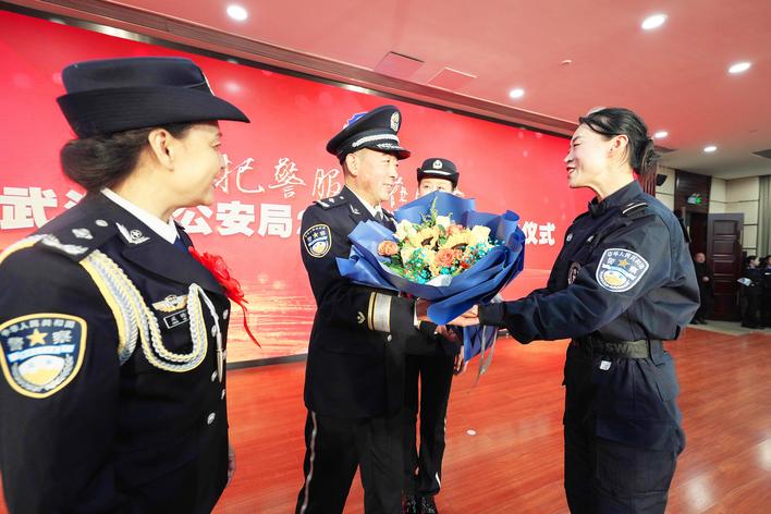 仪式最后,武汉市公安局主要领导代表市局党委和全体民警辅警,向退休民警表示衷心感谢并致以崇高敬意。并表示,薪火相传才能生生不息。站在新的历史起点,要传承好退休同志永葆初心、牢记使命的崇高品质,发扬好他们锐意进取、攻坚克难的战斗精神,弘扬好他们严于律己、廉洁奉公的优良作风,坚持政治建警,从严治警,为加快打造新时代英雄城市创造更加安全稳定的社会环境。
