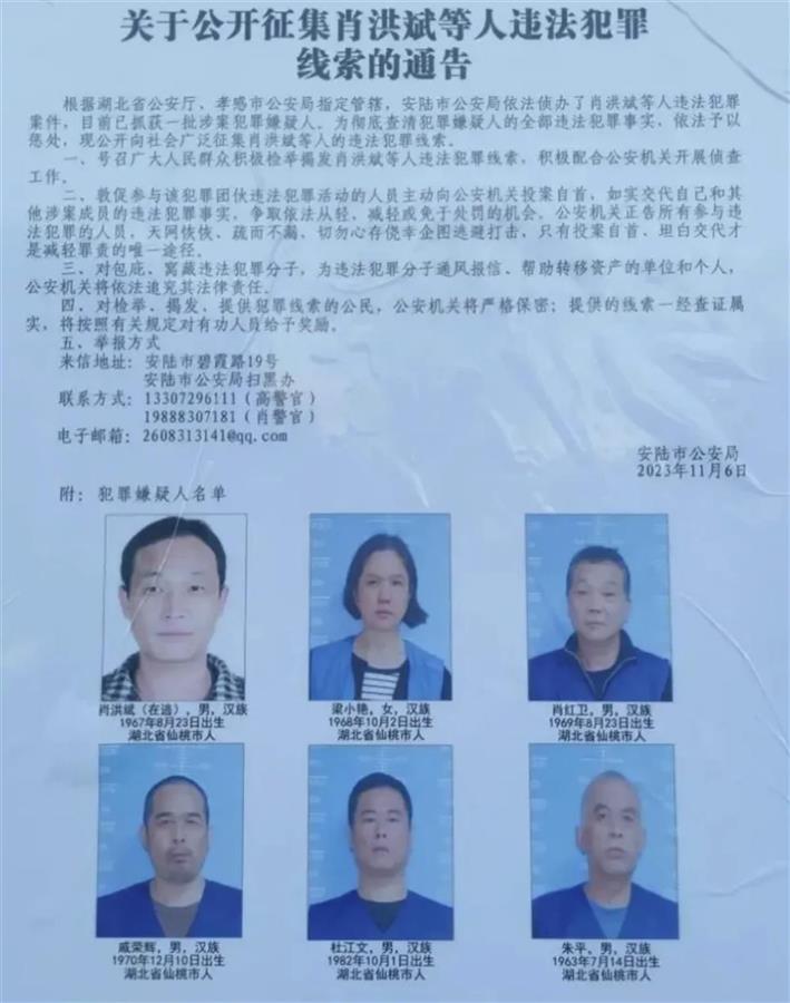 近日,安陆市公安局发布通告,公开向社会广泛征集肖洪斌等人的违法犯罪线索。