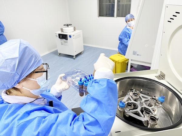 工作人员将洗涤过的粪菌液放入离心机让菌群沉淀
