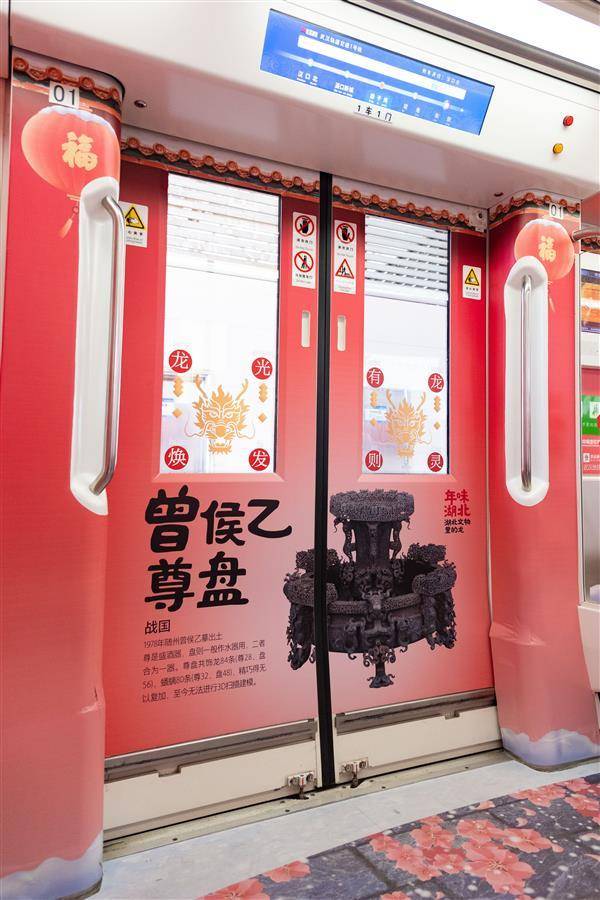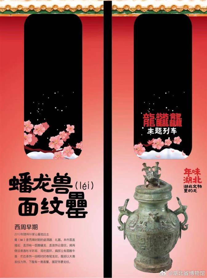此外,“龙专列”具有浓郁荆风楚韵。湖北省博物馆陈列展览部主任曾攀介绍,与龙相关的21件湖北省博物馆馆藏文物跃然于车门和看板之上,比如西周蟠龙兽面纹罍、战国曾侯乙尊盘、明代金镶宝石白玉龙穿牡丹帽顶、乾隆款红彩龙纹高足盖碗等,每一件文物都有“专属名片”,让乘客沾喜气的同时也涨知识。