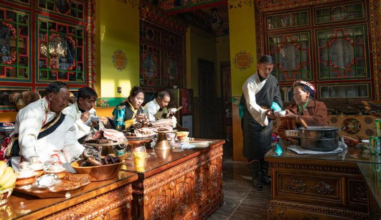 Pasang Butri's families have mutton during the celebration of the farmers' New Year at home in Xigaze, southwest China's Xizang Autonomous Region, Jan. 12, 2024. (Photo by Tenzin Nyida/Xinhua)