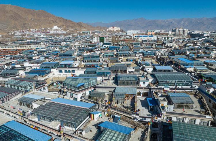 An aerial drone photo taken on Jan. 12, 2024 shows a view of residential houses in Xigaze, southwest China's Xizang Autonomous Region. (Photo by Tenzin Nyida/Xinhua)