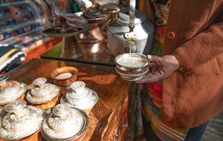 Pasang Butri pours highland barley wine during the celebration of the farmers' New Year at home in Xigaze, southwest China's Xizang Autonomous Region, Jan. 12, 2024. (Photo by Tenzin Nyida/Xinhua)