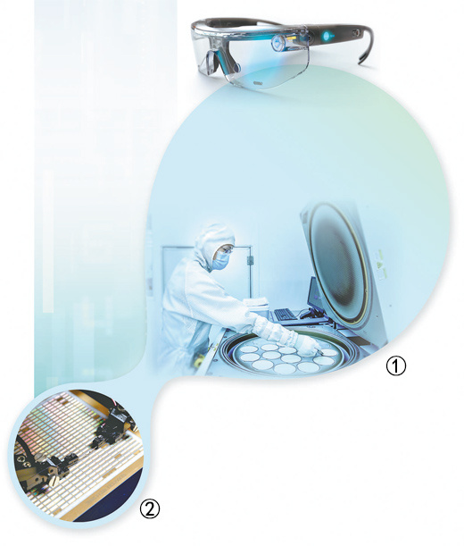图①:晶能光电芯片车间员工在操作设备进行长膜工艺流程。 本报记者 朱 磊摄 图②:晶能光电封装车间机台在测试车用LED灯珠。 资料图片 |