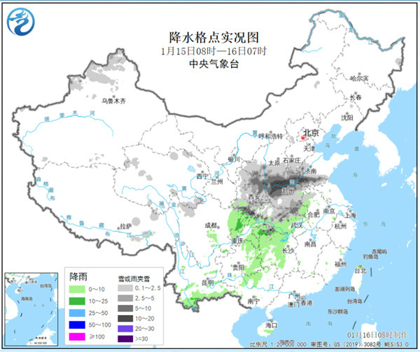 今天白天,河北南部、山东西部、河南、安徽北部、湖北北部和中部、陕西南部等地部分地区有雪花飘落,南方多地以降雨为主。