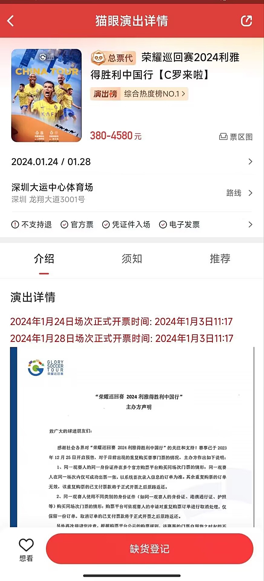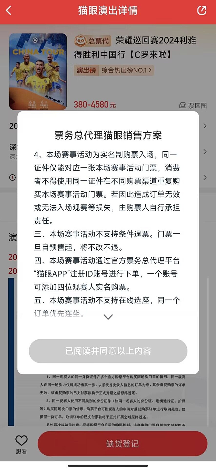 猫眼APP上,“荣耀巡回赛 2024利雅得胜利中国行【C罗来啦】”门票为缺货登记状态