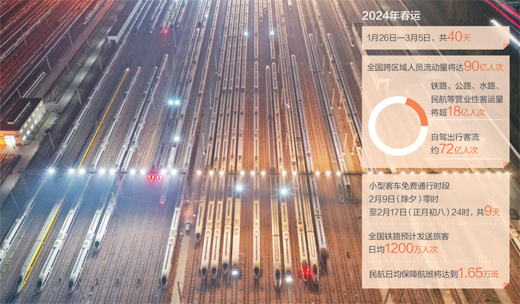 2024年春运从1月26日起至3月5日止,共40天。“今年春运期间客货运输将保持高位运行,呈现出‘两高两大’的特点。”李扬说。