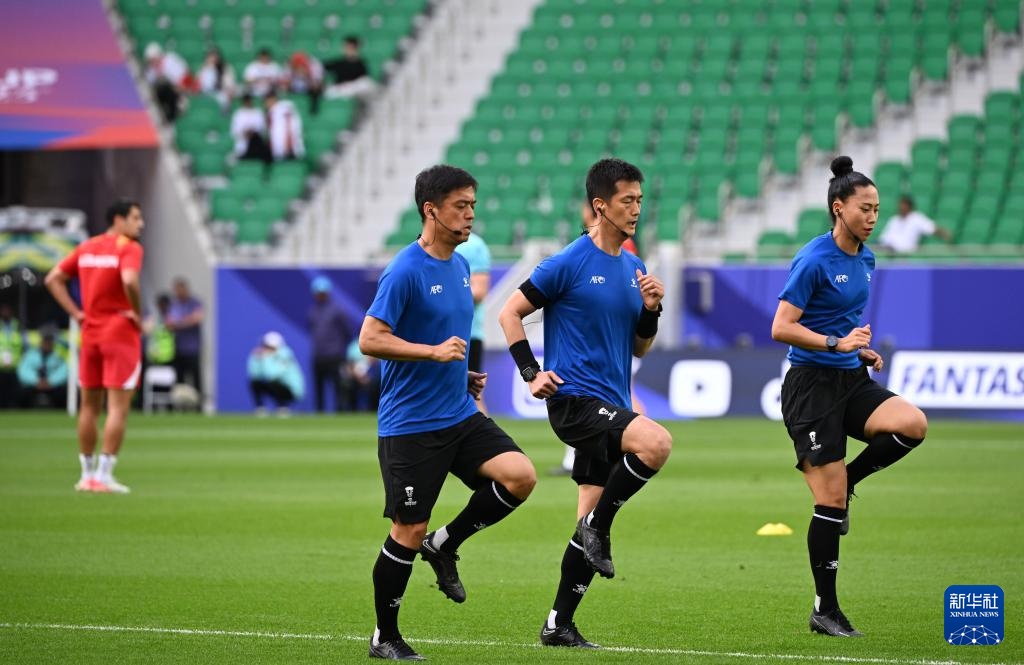 1月17日,本场比赛裁判组在赛前热身。新华社记者 孙凡越 摄