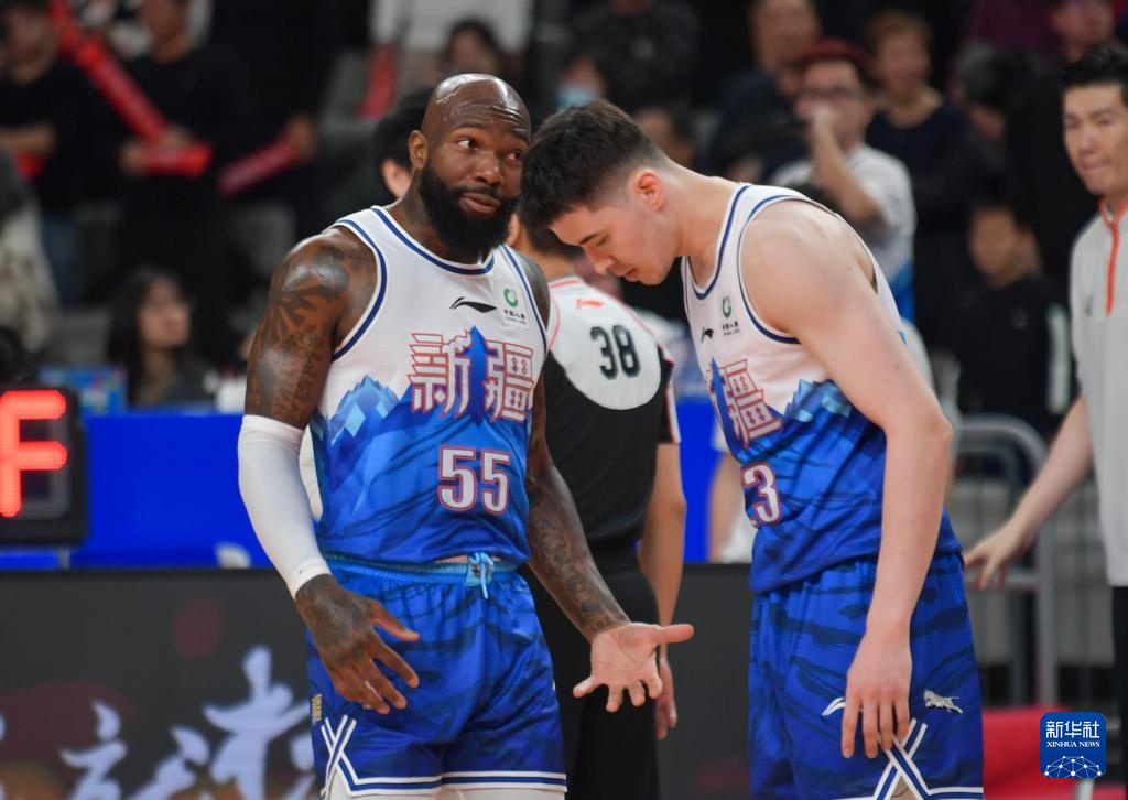 1月17日,新疆伊力特队球员琼斯(左)和阿不都沙拉木在比赛中交流。新华社记者 王菲 摄