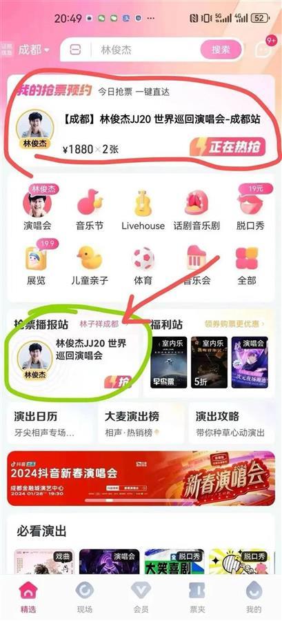 平台一开始拒绝退票的理由是,通过后台核实并非系统“跳票”,也有不少网友质疑,这种情况非常罕见,会不会是网友误操作,而有人截图了当天购票平台的首页,设置有带有林俊杰头像的购票入口,点击就可以直达购票页面,但该窗口的右上角,还有一行小字为“林子祥成都”,不仔细看很难注意到,误点的可能性不是没有。