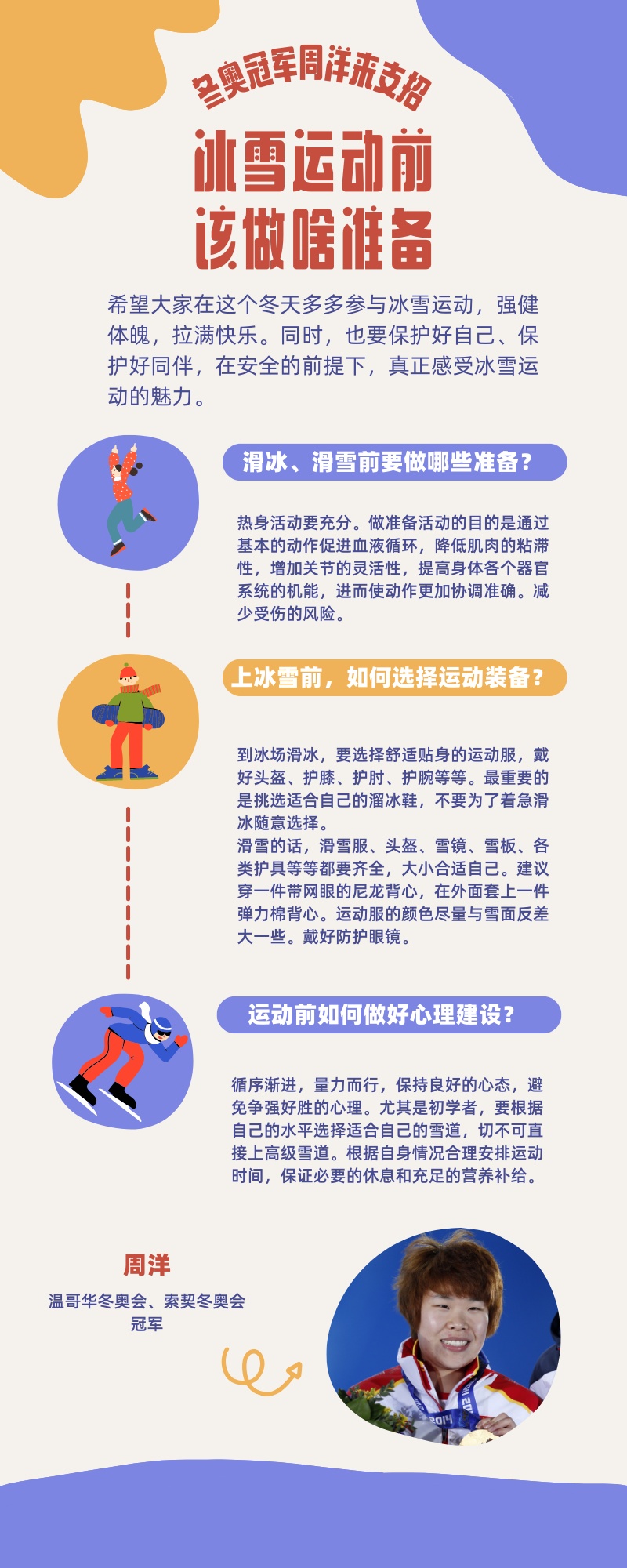 第十四届全国冬季运动会将正式拉开帷幕,全国冰雪运动热度持续高涨。这个冬季,多地滑雪场、滑冰场人气爆棚,民众走上冰雪运动场,尽享冬季运动带来的健康与活力。参加冰雪运动前该做哪些准备?听听冬奥冠军周洋怎么说。