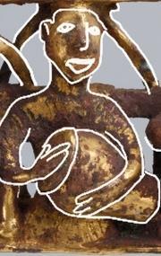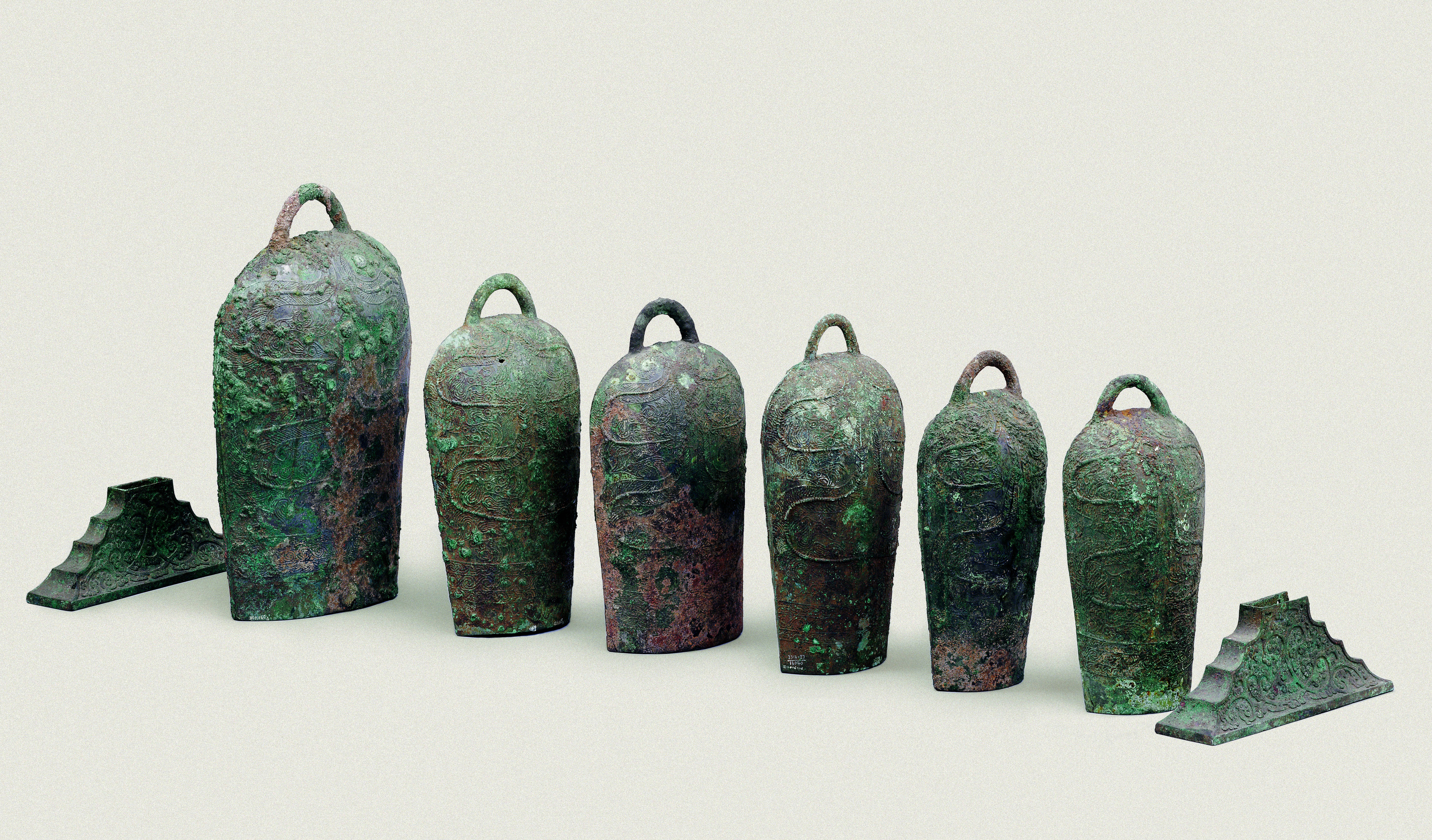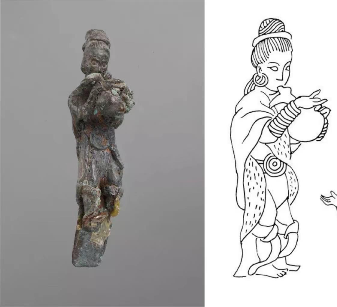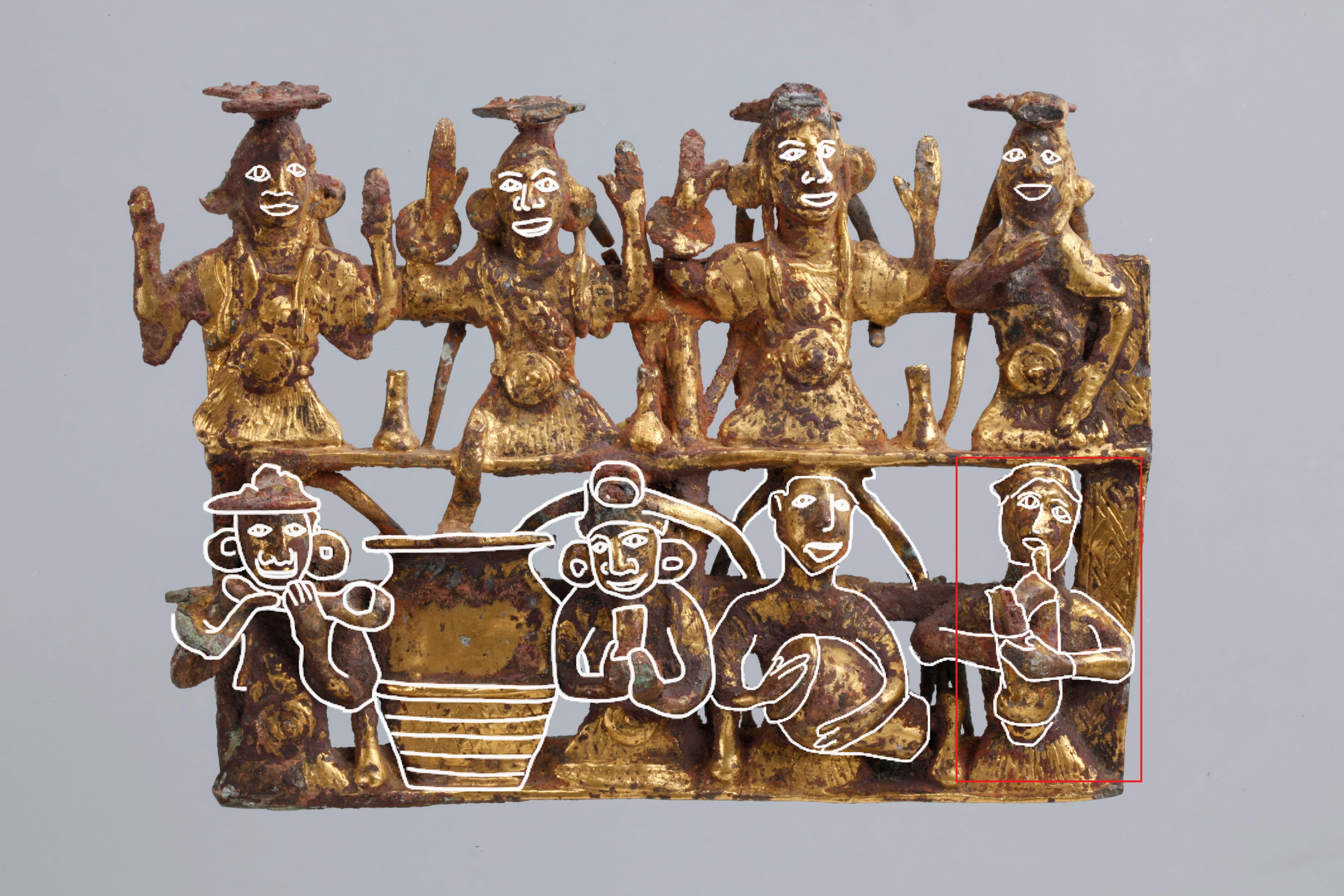 △鎏金八人乐舞铜扣饰(图中演奏者在击打錞于) 云南省博物馆藏