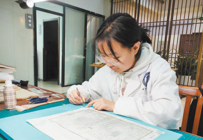 图为安雅楠在修复古籍。 本报记者 宋朝军摄 |