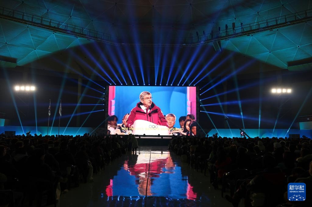 这是1月19日在平昌圆顶体育馆拍摄的开幕式现场,大屏幕上显示画面为国际奥委会主席巴赫在江原道江陵体育馆开幕式现场致辞。新华社记者 胡虎虎 摄