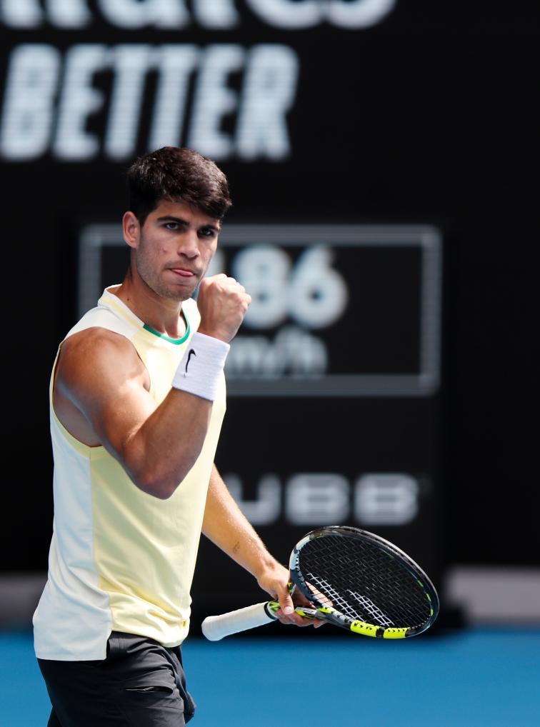 1月20日,阿尔卡拉斯在比赛中庆祝得分。新华社发(胡泾辰摄)