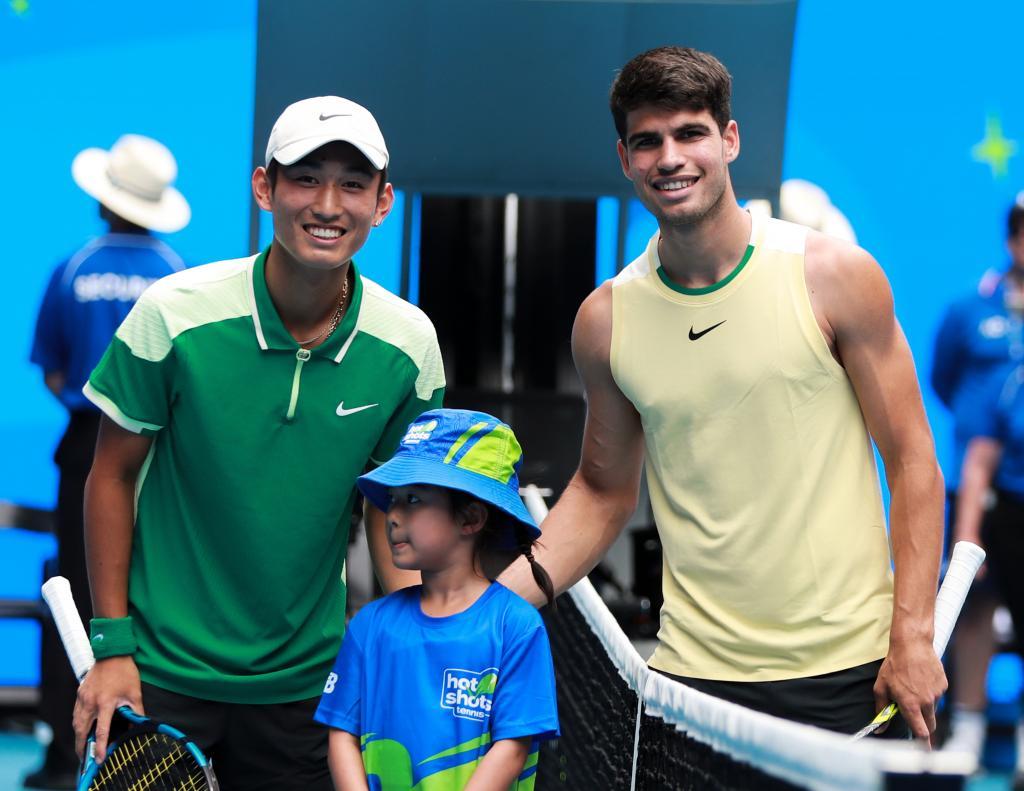 1月20日,商竣程(左)与阿尔卡拉斯赛前合影。新华社记者 马平 摄
