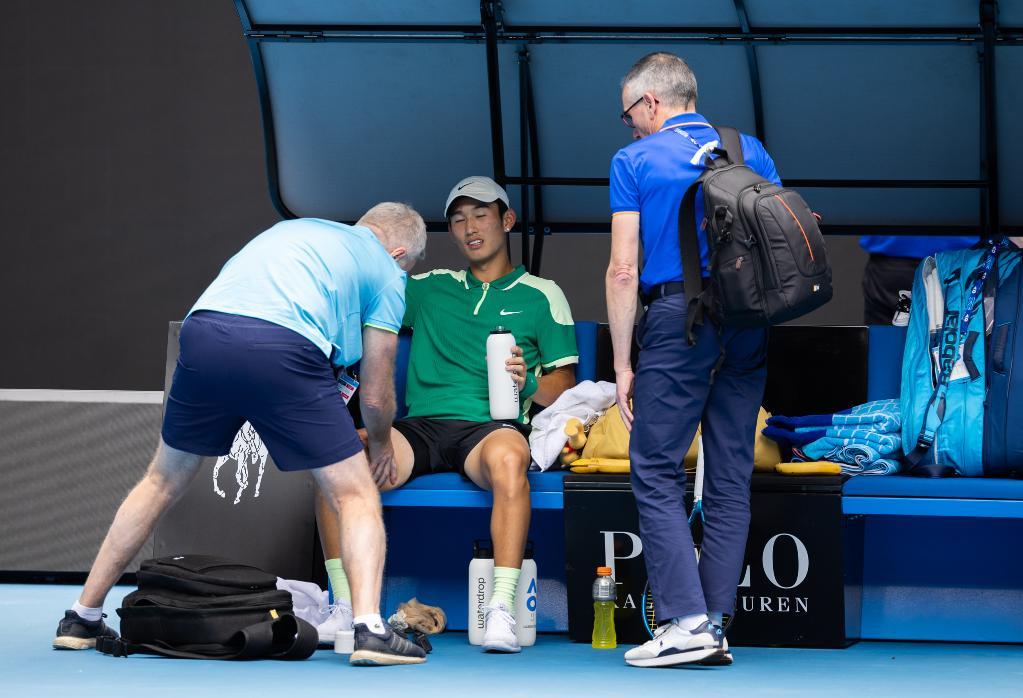 1月20日,商竣程在比赛中因伤接受治疗。新华社发(胡泾辰摄)