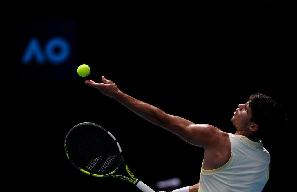 1月20日,阿尔卡拉斯在比赛中发球。新华社记者 马平 摄