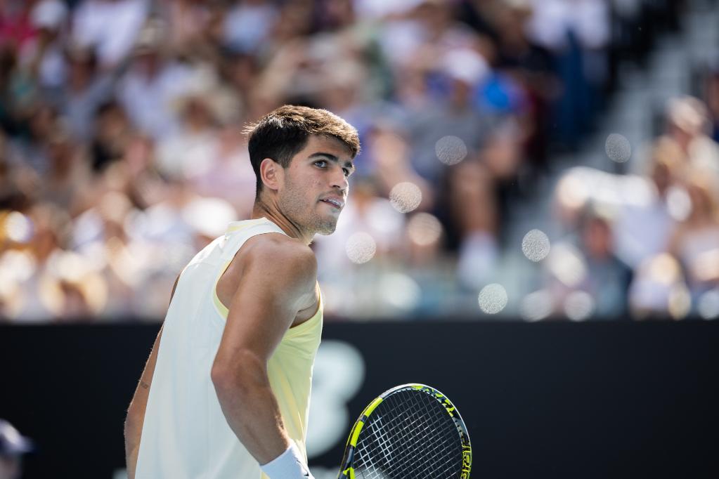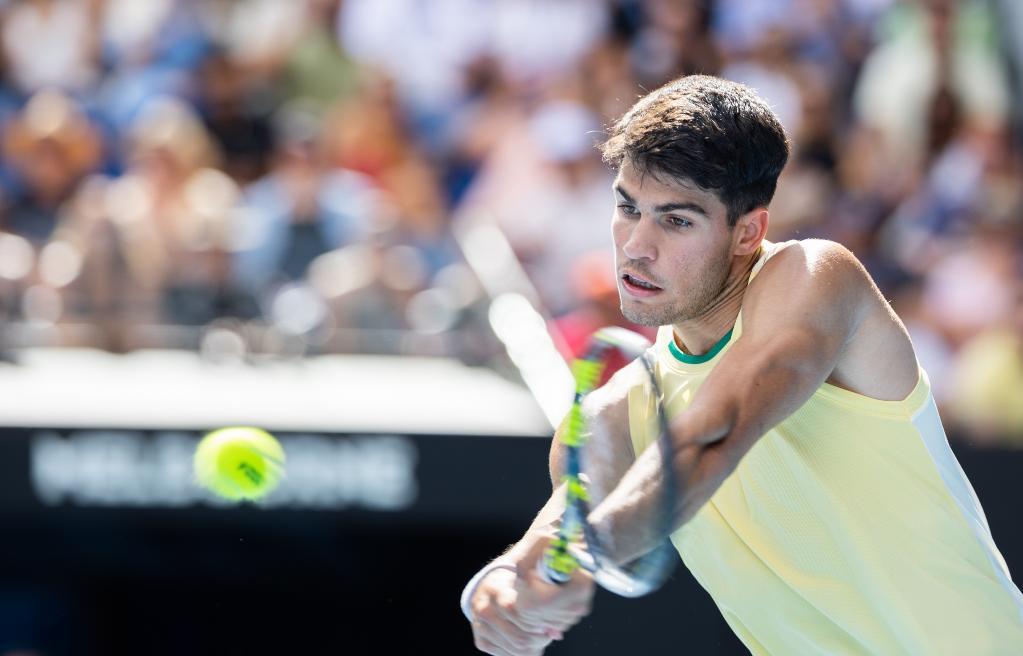 1月20日,阿尔卡拉斯在比赛中回球。新华社发(胡泾辰摄)