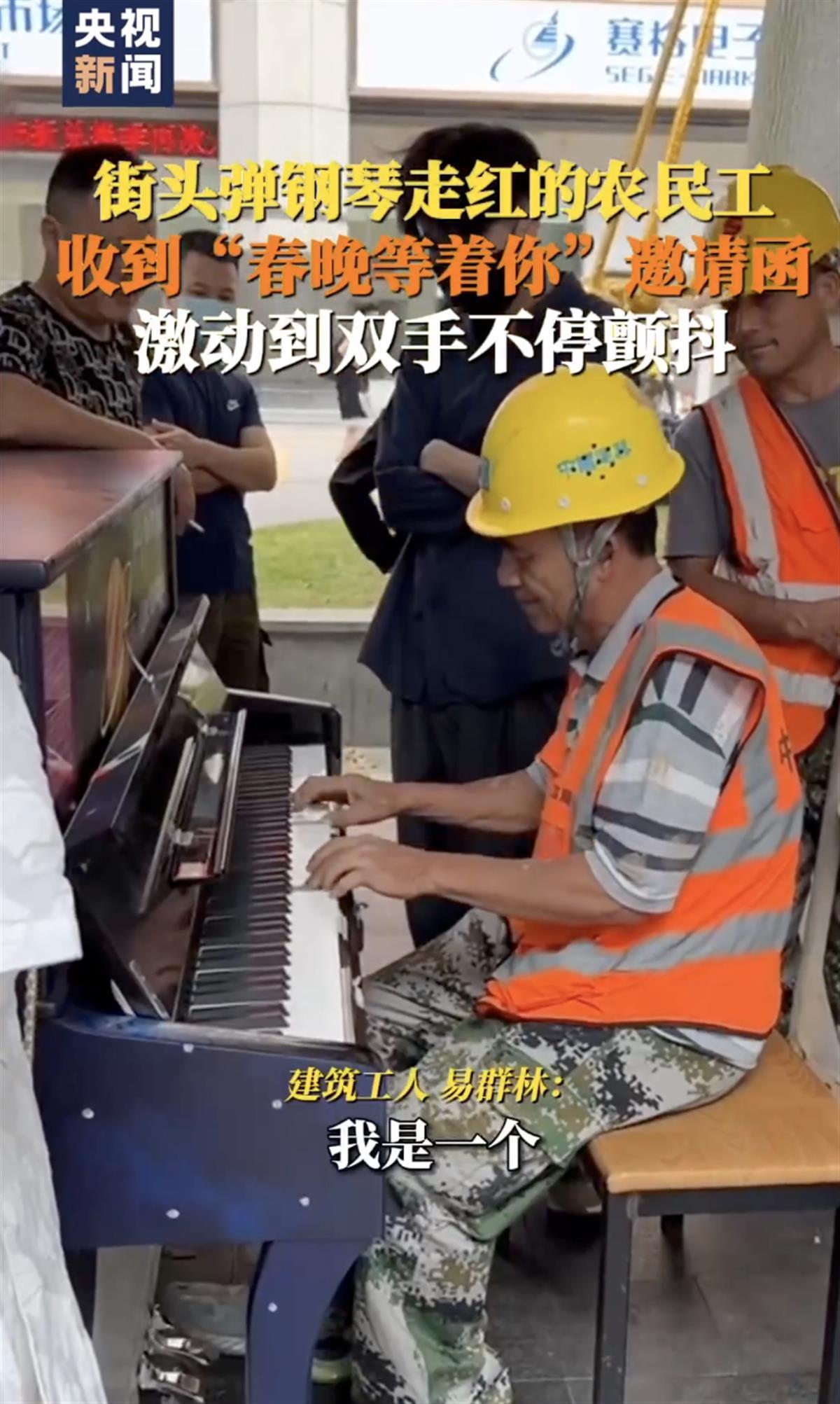 深圳的建筑工人易群林,曾因在街头弹奏钢琴的视频走红网络,近日,他收到央视总台“春晚等着你”邀请函,可以有机会前往现场观看春晚,近距离感受央视春晚的喜庆氛围。(据1月21日深圳特区报)