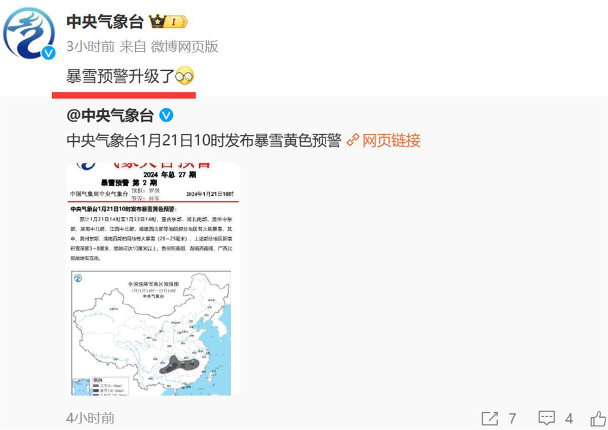 继中央气象台1月21日6时发布暴雪蓝色预警后,10时,升级发布了暴雪黄色预警: