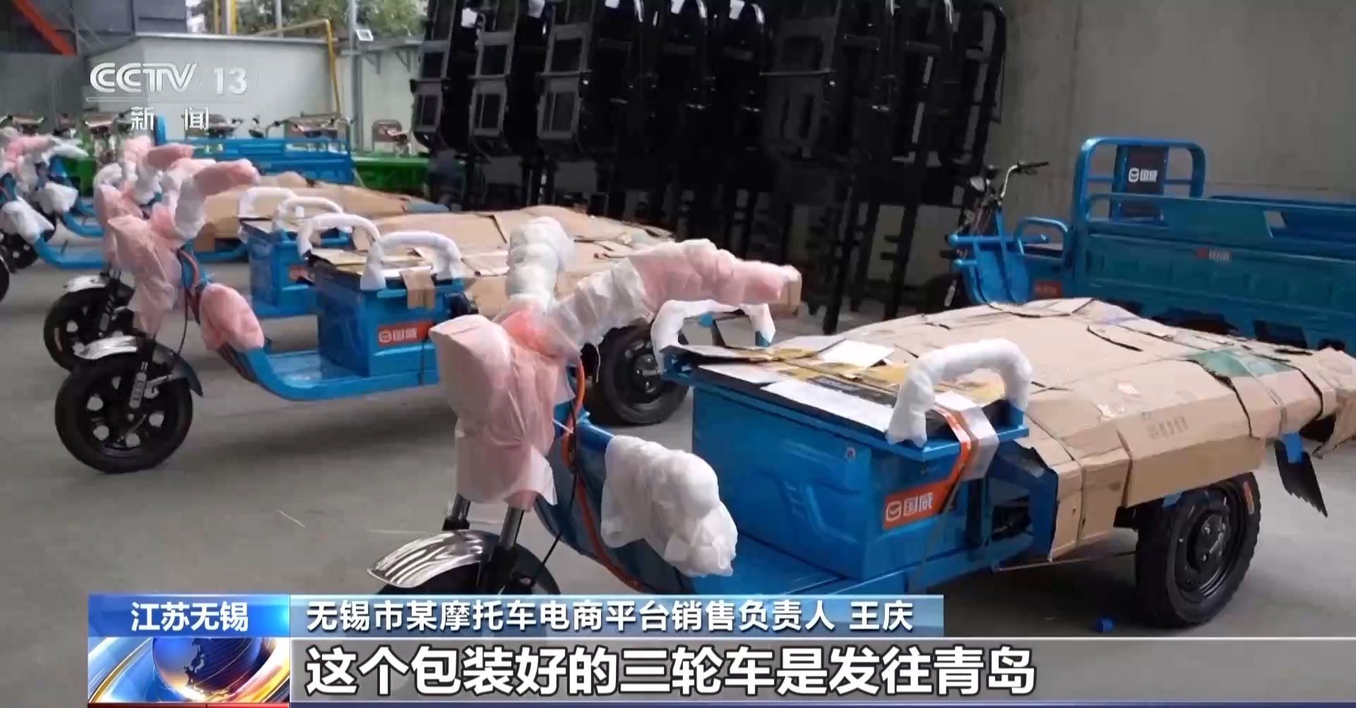 无锡某摩托车电商平台销售负责人 王庆:包装好的三轮车是发往青岛,走青岛的海运港口,装木箱包装,发往美国。