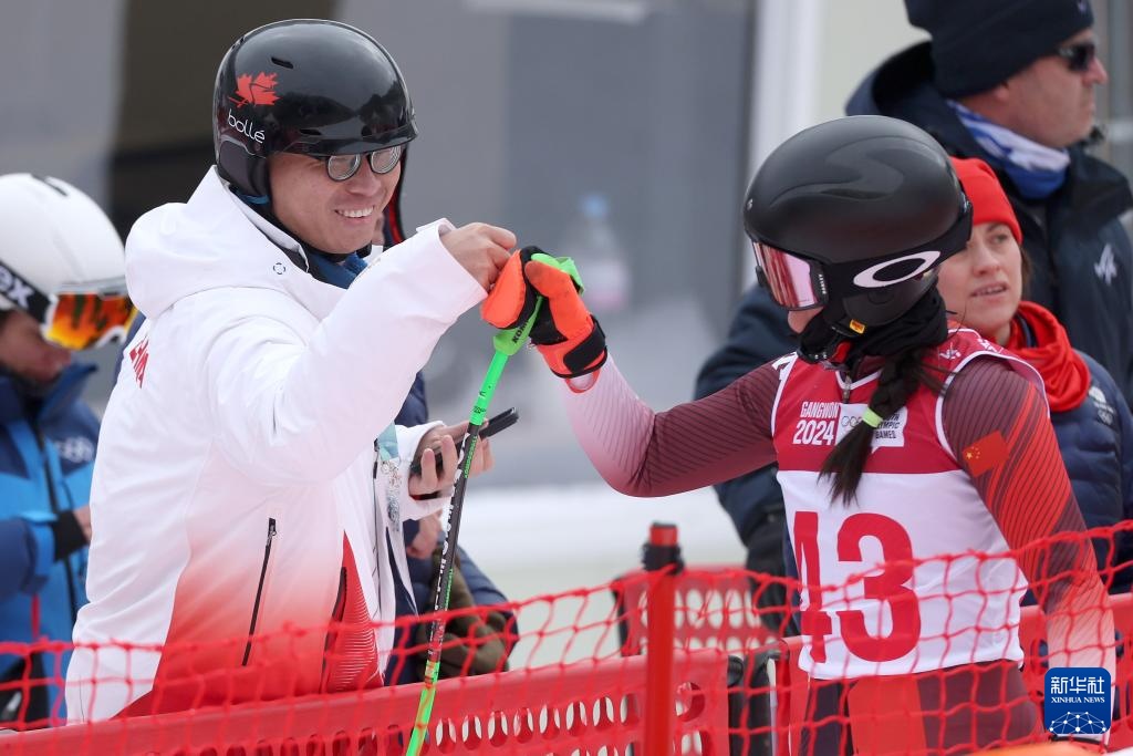 1月21日,张桂园(右前)在比赛后与江原道冬青奥会中国高山滑雪队领队肖芳萱庆祝完赛。新华社记者 李明 摄