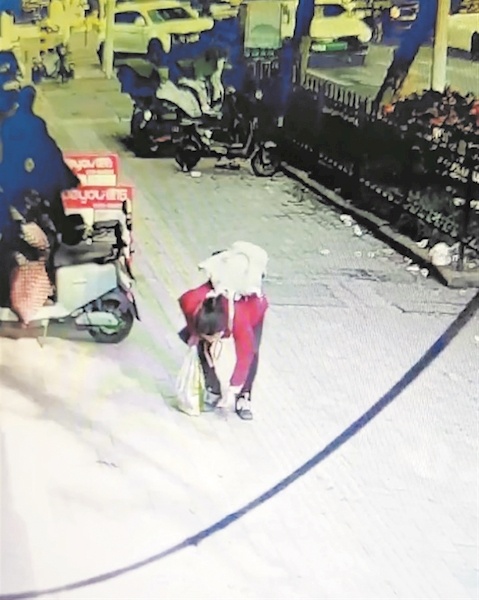 民警胡成兴在城市视频中看到,周女士经过宝岛公寓附近时,走在她身后的一名女子忽然弯腰下蹲,从地上捡起一件物品。这名女子看上去50多岁,随后进入宝岛公寓小区。
