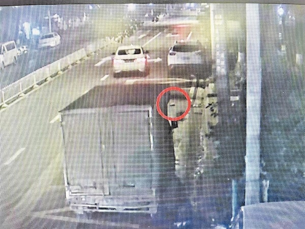 这辆电动自行车刚离开,一名男子走来,捡起包包,走向附近某酒店停车场。