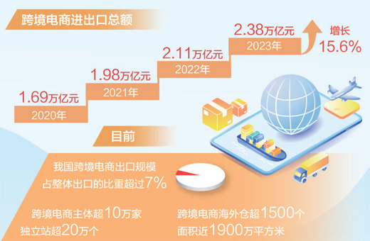 据海关测算,2023年,我国跨境电商进出口总额2.38万亿元,增长15.6%。其中,出口1.83万亿元,增长19.6%;进口5483亿元,增长3.9%。跨境电商快速发展,既满足了国内消费者多样化个性化需求,又助力我国产品通达全球,成为外贸发展的重要动能。
